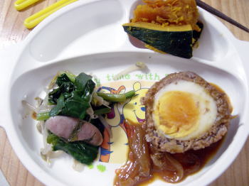 ひき肉が苦手な息子もハンバーグはよく食べてくれます。ゆで卵を包みいつもと違ったハンバーグにしました。
